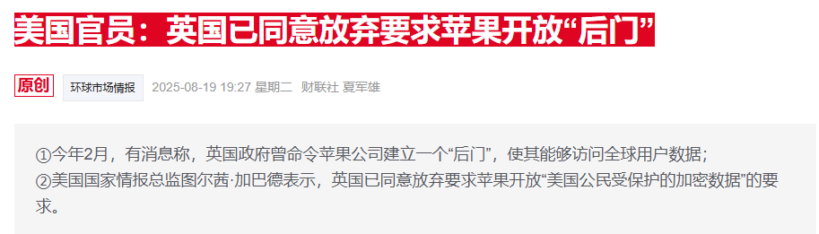 上周,美国国家情报总监图尔茜·加巴德称,英国已不再强制要求苹果提供“后门”。当时就有知情人士指出,尽管英国已同意撤销该命令,但尚未被正式撤回。