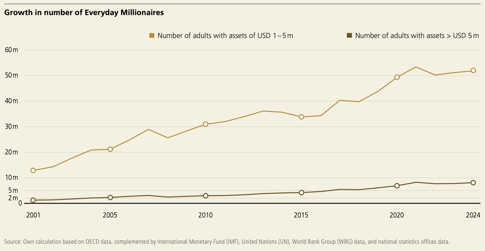 根据报告,自2000年以来,全球EMILLIs人数从略高于1300万增长至约5200万,在25年间翻了近四倍。截止2024年底,他们合计掌握约107万亿美元的财富,与资产超过500万美元的富豪(119万亿美元)几乎相当。