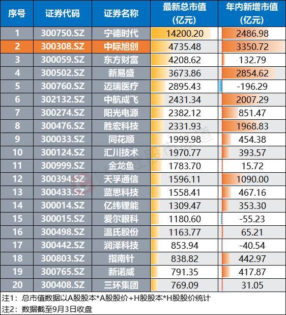 财联社9月3日电,今日(9月3日),中际旭创大涨超10%,总市值攀升至4735.48亿元,首次超越东方财富(4208.62亿元),并跃居创业板总市值第二位。从年内行情上看,中际旭创今年总市值一路飙升,年内累计增长3350.72亿元,增长规模在整个创业板中位居第一。除中际旭创外,新易盛、宁德时代、中航成飞、胜宏科技、天孚通信5股年内总市值增长规模也均超1000亿元。(财联社 梓隆)