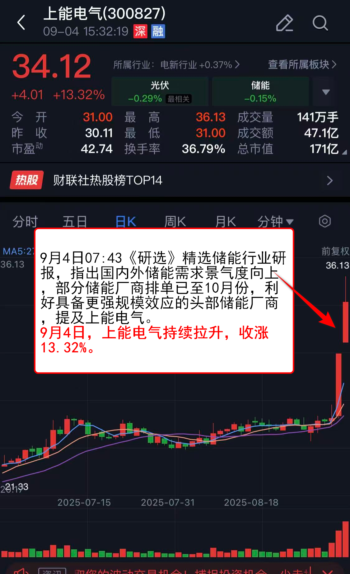 9月4日07:43《研选》精选储能行业研报,指出国内外储能需求景气度向上,部分储能厂商排单已至10月份,利好具备更强规模效应的头部储能厂商,提及上能电气。9月4日,上能电气持续拉升,收涨13.32%。