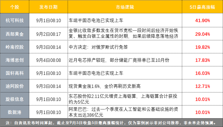 往期回顾:近期《九点特供》跟踪梳理固态电池、黄金等方向的资讯并加以解读,提及多只大涨的上市公司。9月1日08:10栏目解读龙头板块固态电池,指出短期来看氧化物半固态路线相对成熟,和现有电池体系设备兼容度较高,已产业化落地,有望放量,提及杭可科技,其在9月5日收获20cm涨停。