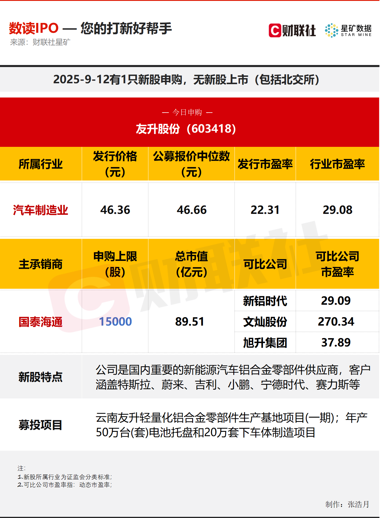财联社9月12日讯,今日有1只新股申购,为沪市主板的友升股份;无新股上市。