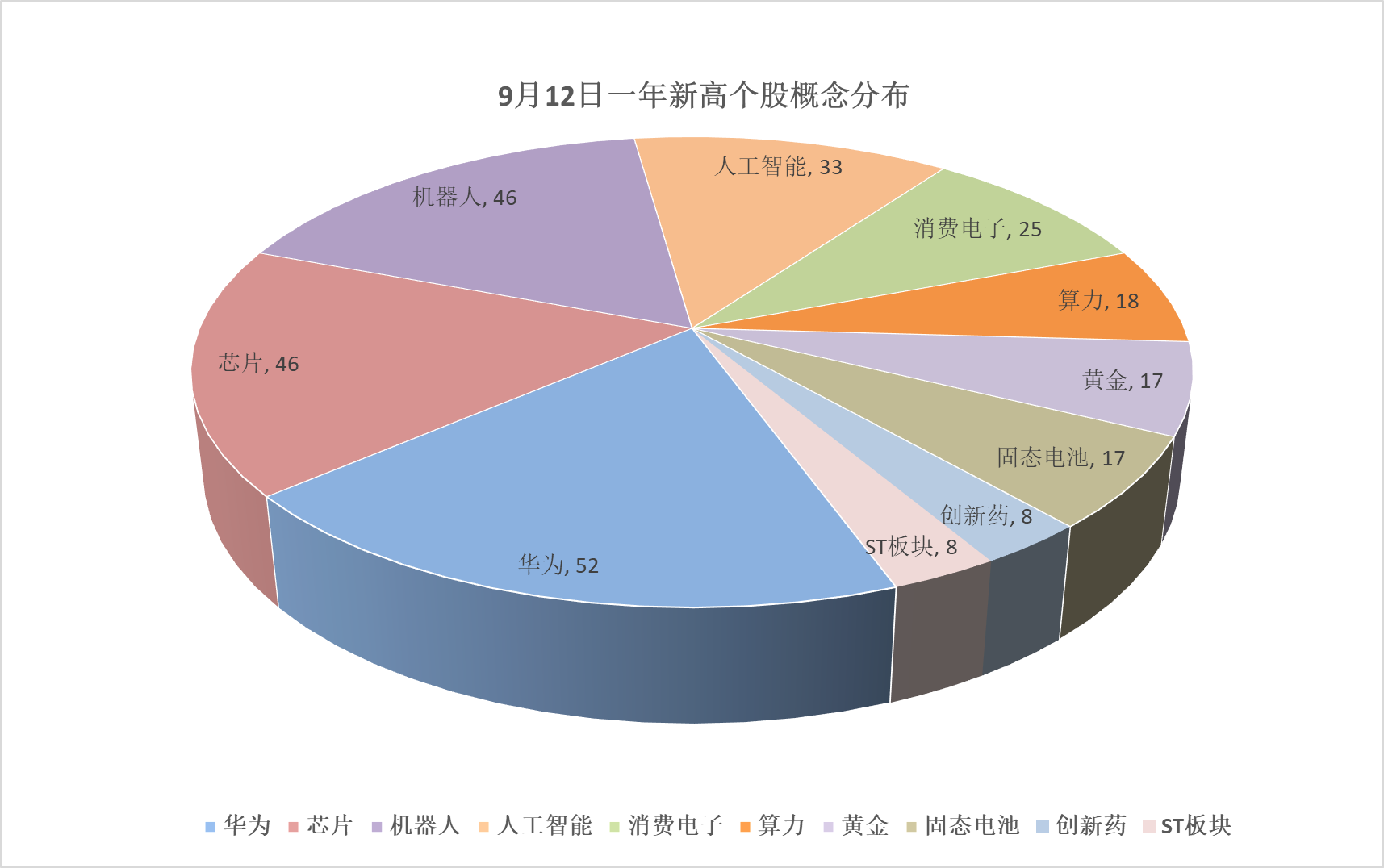 点评:创一年新高个股较上个交易日增加66家至231家。其中,前三的华为、芯片、机器人概念分别有52、46、46家个股创一年新高。今日共66股涨停,连板股总数18只,23股封板未遂,封板率为74%(不含ST股、退市股)。