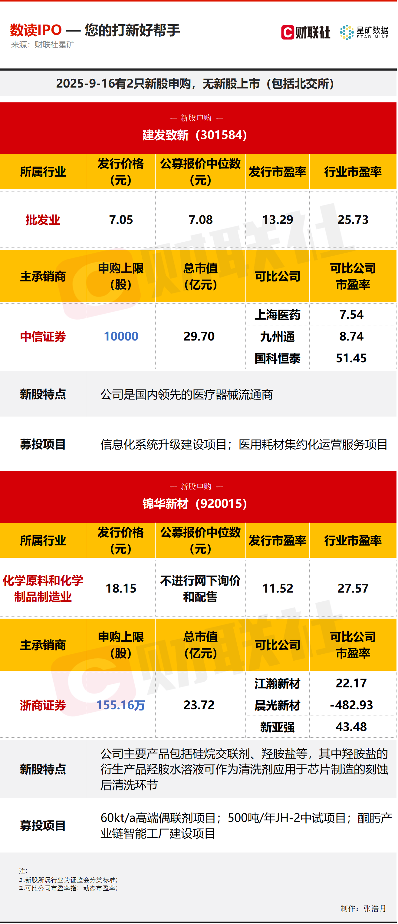 财联社9月16日讯,今日有2只新股申购,分别为创业板的建发致新,北交所的锦华新材;无新股上市。