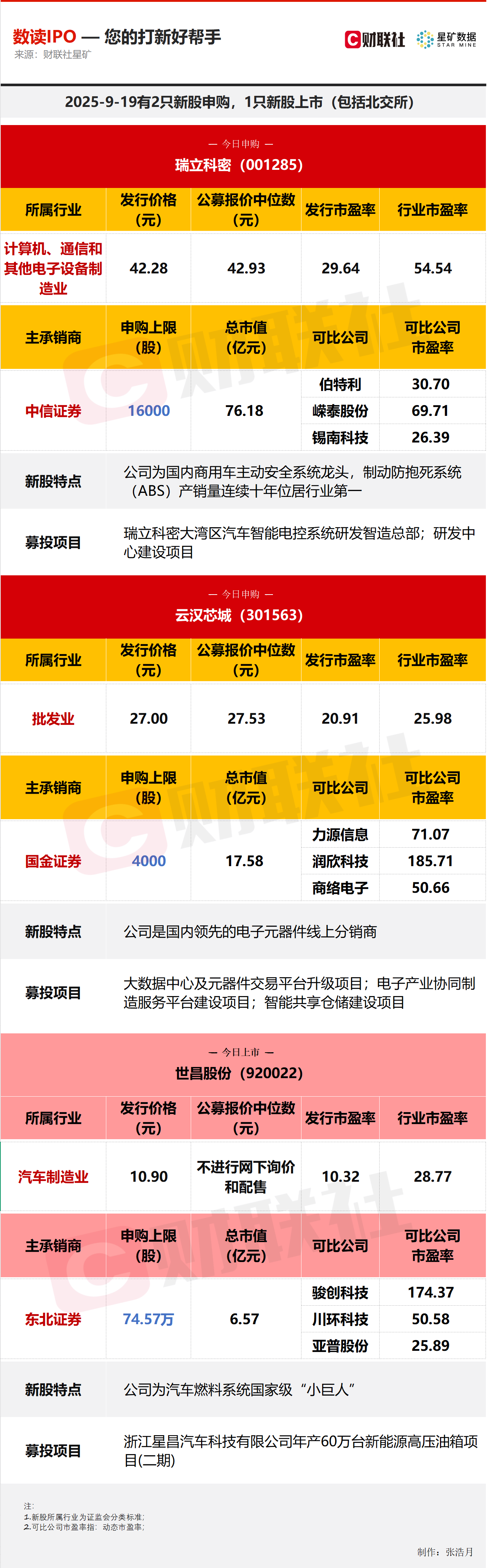 财联社9月19日讯,今日有2只新股申购,分别为深交所的瑞立科密、云汉芯城;1只新股上市,为北交所的世昌股份。