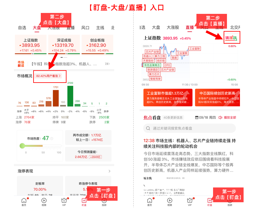 (3)【盯盘-大盘】或【盯盘-直播】页面也可便捷参与,温馨提醒仅盘中可见哦!