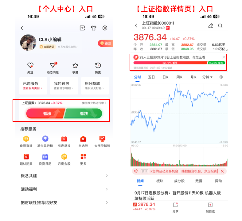 从财联社App端目前可通过下面四种方式进入「猜涨跌」: