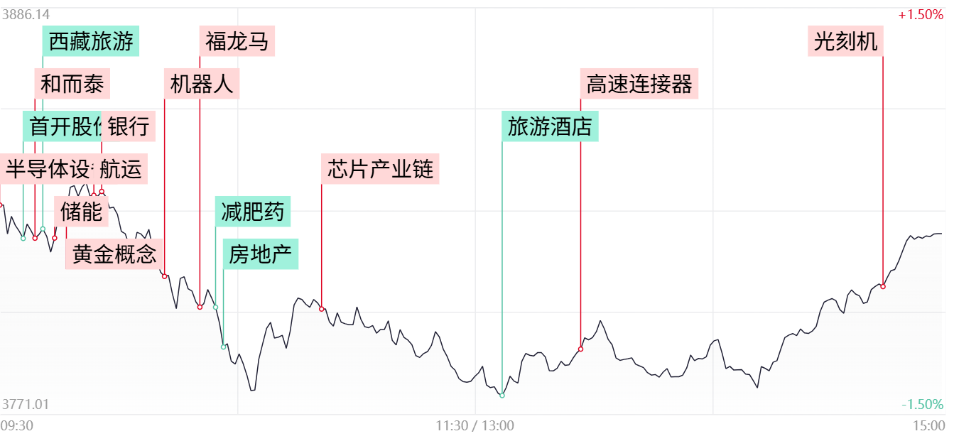 ②盘面上来看,科技股集体反弹,存储芯片全线爆发,逾20股涨超10%,而算力硬件、商业航天等同样涨幅居前。