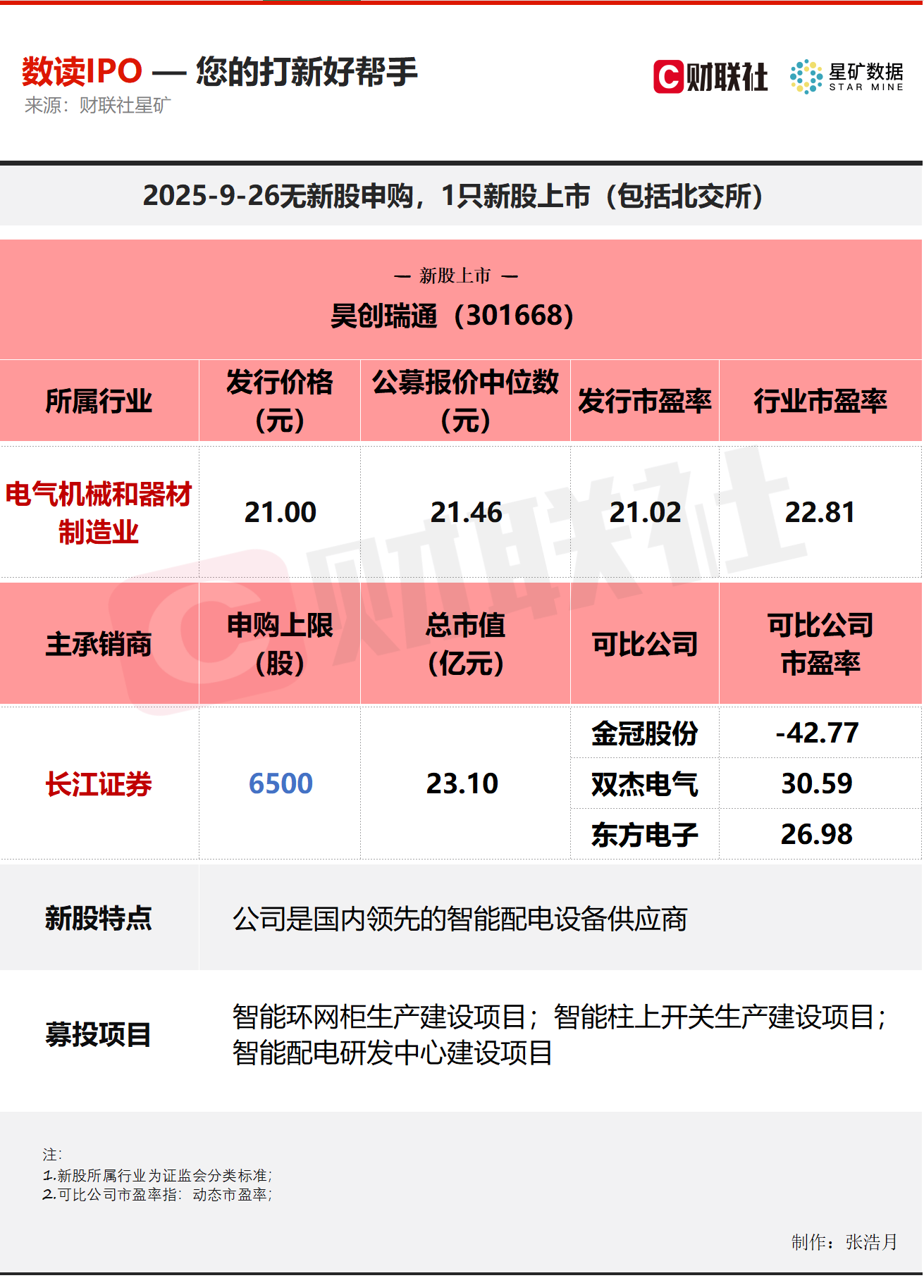 财联社9月26日讯,今日无新股申购;有1只新股上市,为创业板的昊创瑞通。