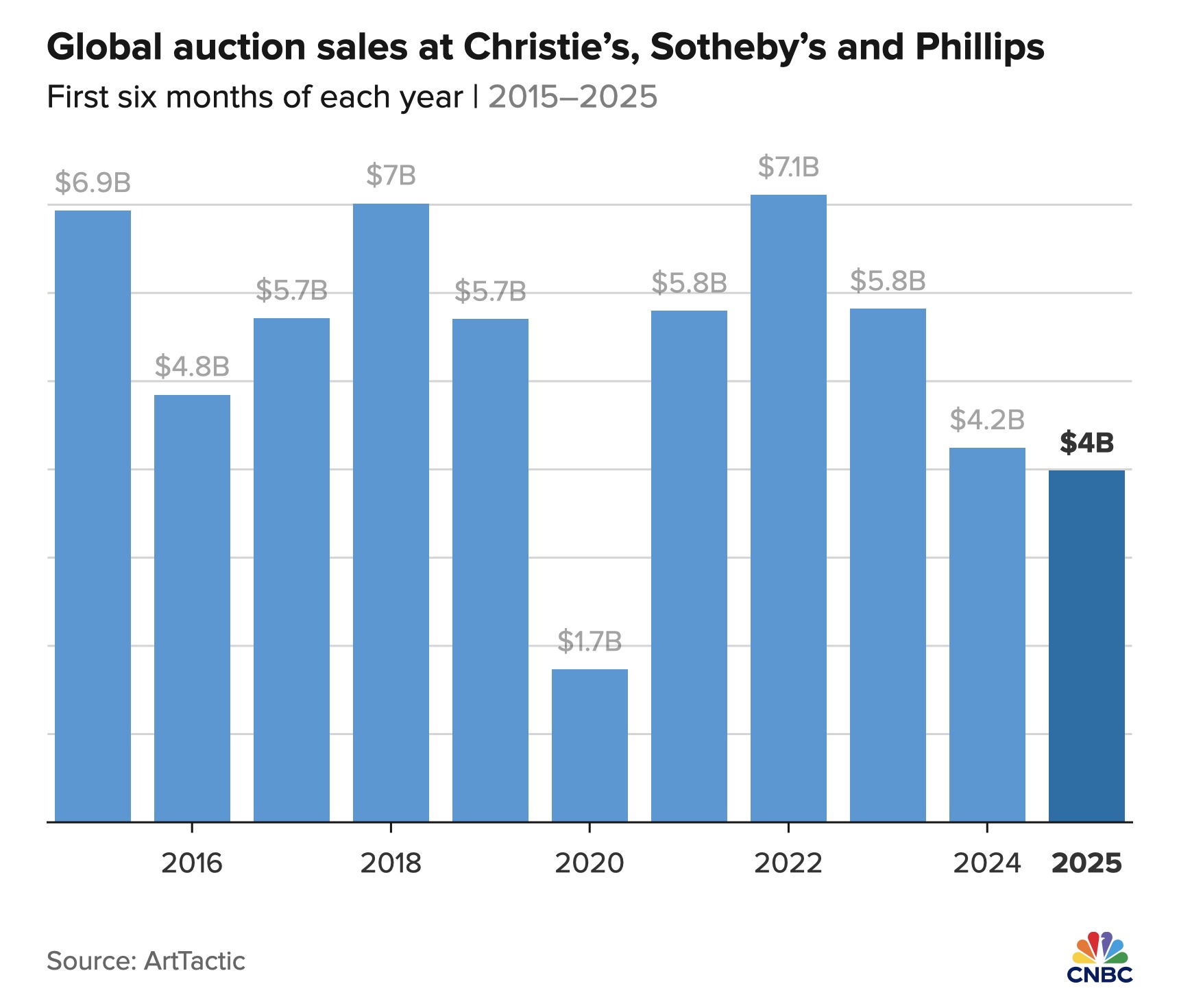 更早之前,艺术市场研究公司ArtTactic发布的另一份调研报告也讲述了相同的困境。2025年上半年,三大拍卖行苏富比(Sotheby’s)、佳士得(Christie’s)及富艺斯(Phillips)的艺术品成交总额同比下滑6%,跌至39.8亿美元,创下十年来新低(不计入2020年疫情特殊年份)。