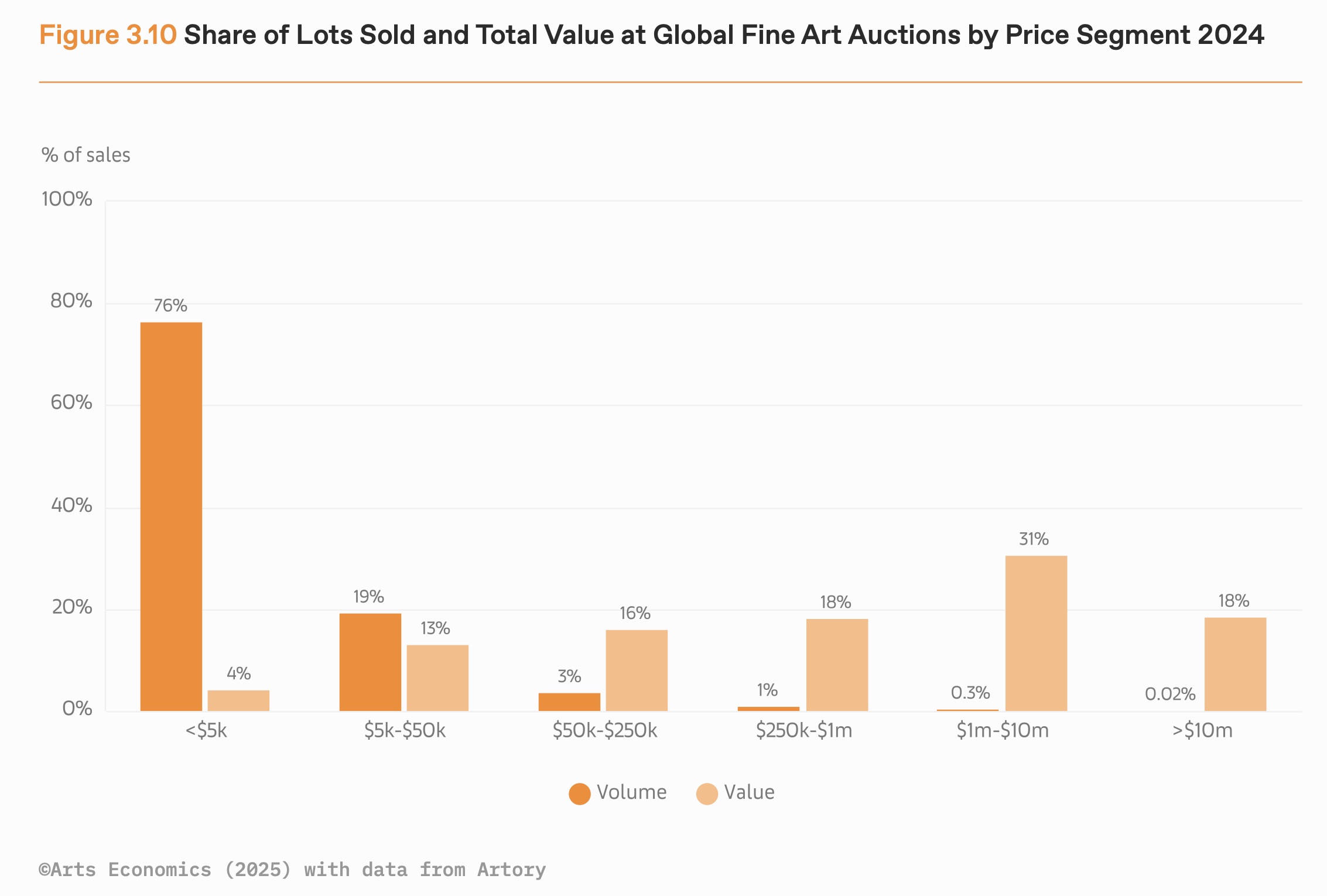 2024年全球艺术品拍卖成交份额及总价值,按价格组别划分(报告截图)