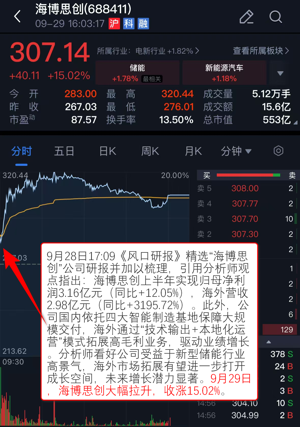 9月28日17:09《风口研报》精选“海博思创”公司研报并加以梳理,引用分析师观点指出:海博思创上半年实现归母净利润3.16亿元(同比+12.05%),海外营收2.98亿元(同比+3195.72%)。此外,公司国内依托四大智能制造基地保障大规模交付,海外通过“技术输出+本地化运营”模式拓展高毛利业务,驱动业绩增长。分析师看好公司受益于新型储能行业高景气,海外市场拓展有望进一步打开成长空间,未来增长潜力显著。9月29日,海博思创大幅拉升,收涨15.02%。