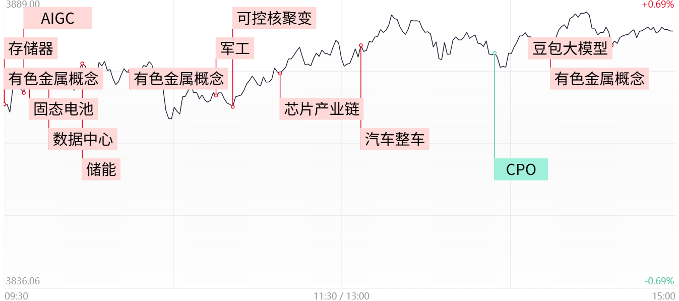 ②盘面上来看,科技股集体反弹,存储芯片全线爆发,逾20股涨超10%,而算力硬件、商业航天等同样涨幅居前。
