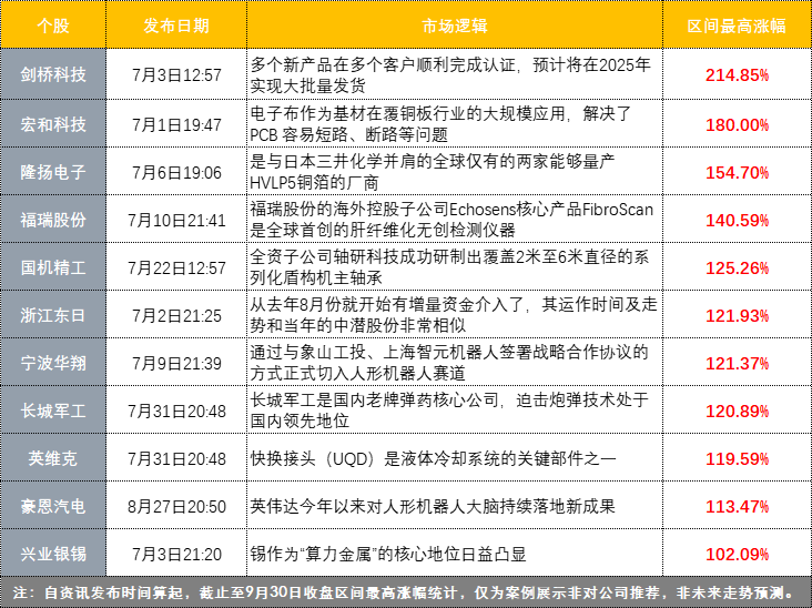 截至9月29日收盘,其最高涨幅达214.85%,股价创下历史新高。