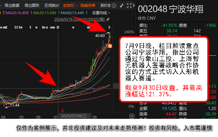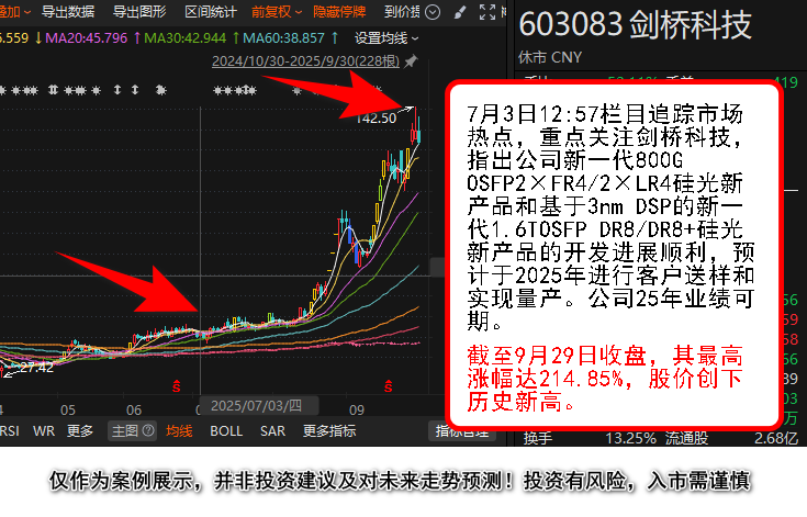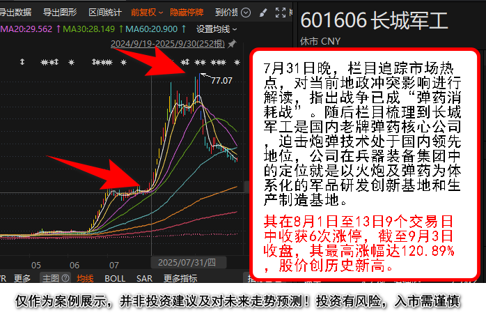 三季度中,指数呈现出震荡拉升态势,涌现了一批强势的板块诸如科技方向的算力硬件、机器人等方向及核心公司,并孕育了不错的赚钱效应。短线来看,多家人气公司受催化后股价爆发拉升,栏目及时追踪,帮助投资者高效复盘当日行情,并以资金面、情绪面、消息面等维度多角度解读,提及相关公司受到主力资金青睐后能维持强势状态,其中包含解读后豪取4连板的长城军工,还有区间最高涨幅超214%的剑桥科技。具体如何?下面跟着小编一起,回顾下期间栏目的表现。
