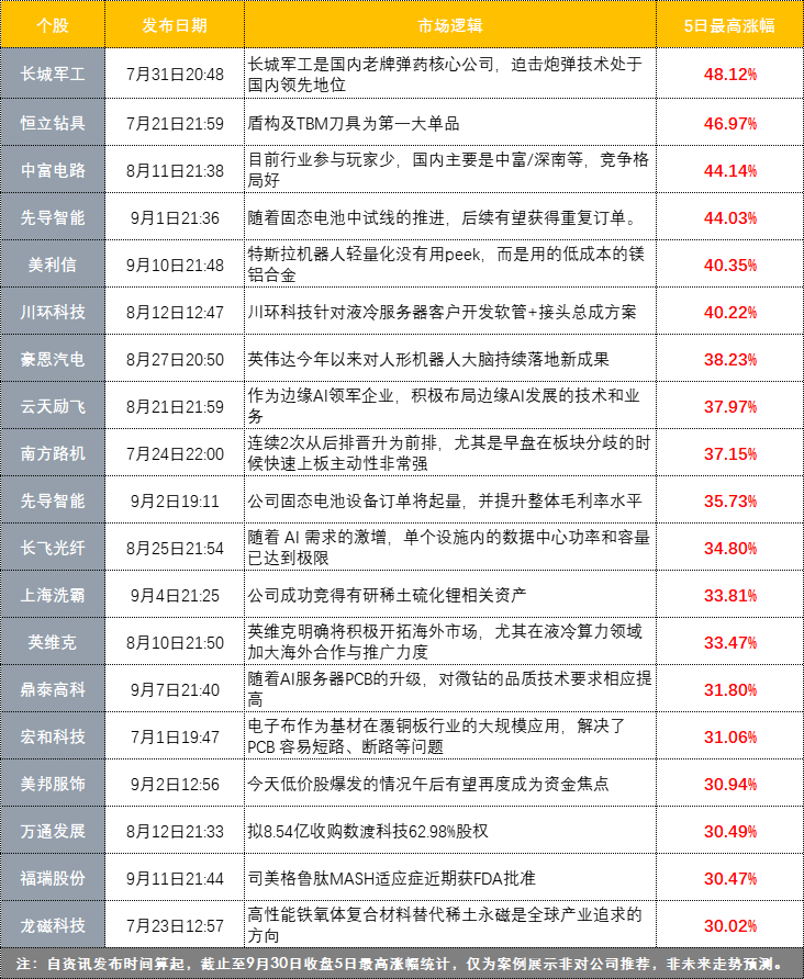 附上三季度中栏目梳理的5日最高涨幅超30%的公司及相关资讯。