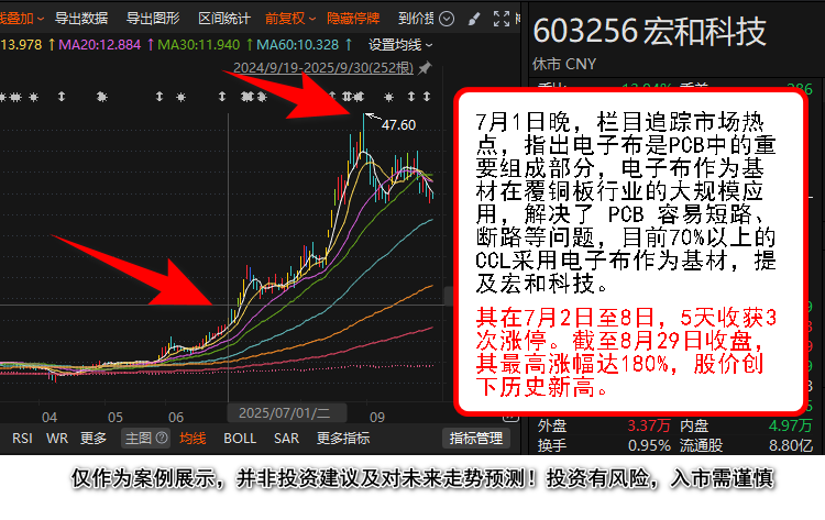 随后栏目引用天风电新对电子布的空间测算,指出假设英伟达中长期GPU年出货量650万颗,GB200、GB300、Rubin出货高峰期占比都为70%,一代布对应高峰期年市场空间32亿元;二代布对应高峰期年市场空间77亿元;三代布对应高峰期年市场空间184亿元,市场空间广阔。主要相关标的是宏和科技和中材科技,与PCB整体涨幅相比均处于相对低位,有望持续补涨,其中宏和科技走势更为强劲。