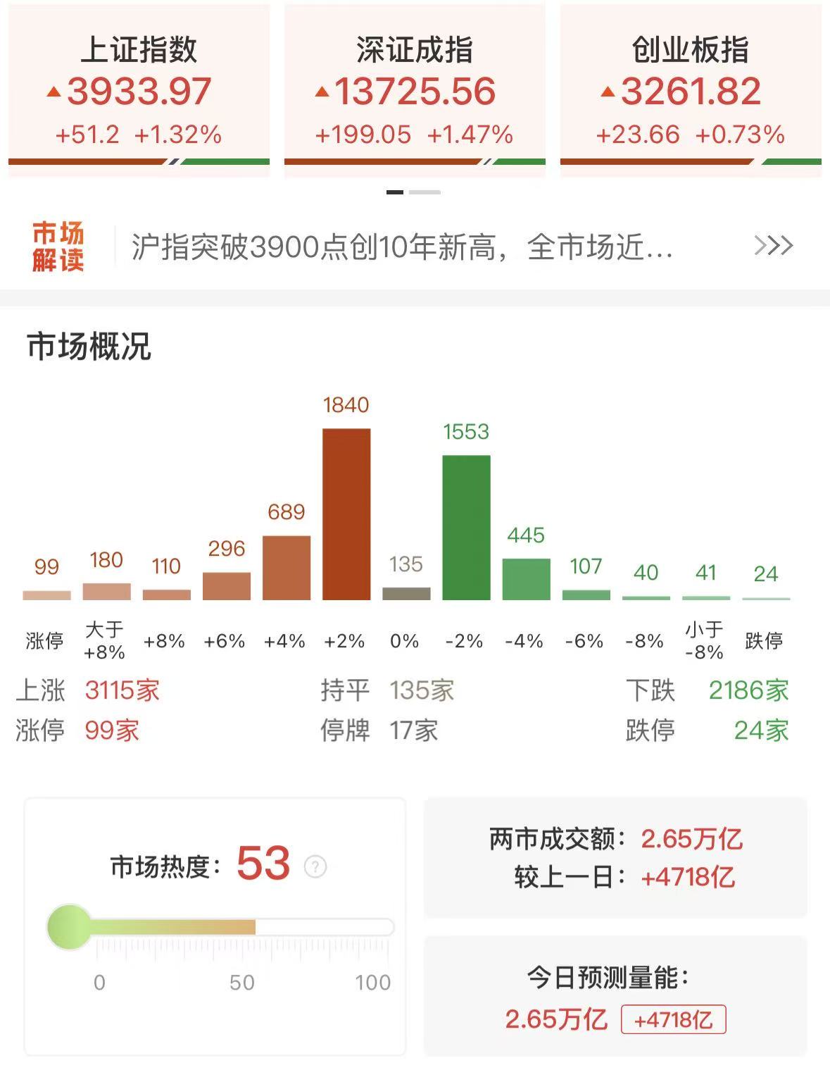 今日市场全天震荡走高,三大指数全线收红,沪指突破3900点整数大关创下10年新高,两市成交额再度放大至2.65万亿,依旧维持价涨量增的良性结构。不过在目前市场整体位阶相对较高的背景下,若仍想要持续走强的话,后市量能的大小仍是关键,一旦量能再度萎缩的话,大概率仍以震荡上行为主。而从盘面维度来看,虽然指数一路向上,但个股的结构性分化仍在延续,目前来看,科技成长和部分周期股风格相对占优,热点主要围绕着有色、半导体芯片、AI产业链、固态电池、人形机器人等方向展开,把握轮动轮动节奏或仍是当前应对的重点。