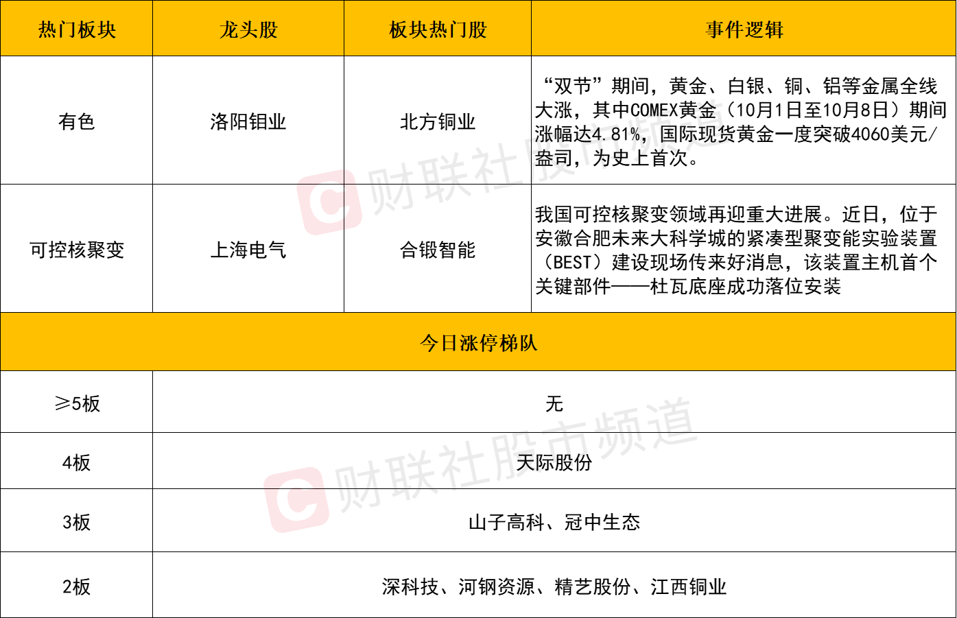财联社10月9日讯,沪指高开高走突破3900点整数大关,刷新2015年8月以来新高。创业板指和科创50指数冲高回落。沪深两市成交额2.65万亿,较上一个交易日放量4718亿。盘面上,市场热点轮番活跃,全市场共有99只个股涨停。从板块来看,有色金属、核电板块上演涨停潮。核电板块表现活跃,合锻智能8天4板,永鼎股份、安泰科技等十余股涨停。有色金属板块全天走强,精艺股份6天5板,江西铜业、河钢资源等十余股涨停。下跌方面,影视院线概念股集体大跌,中国电影等股跌停。截至收盘,沪指涨1.32%,深成指涨1.46%,创业板指涨0.73%。