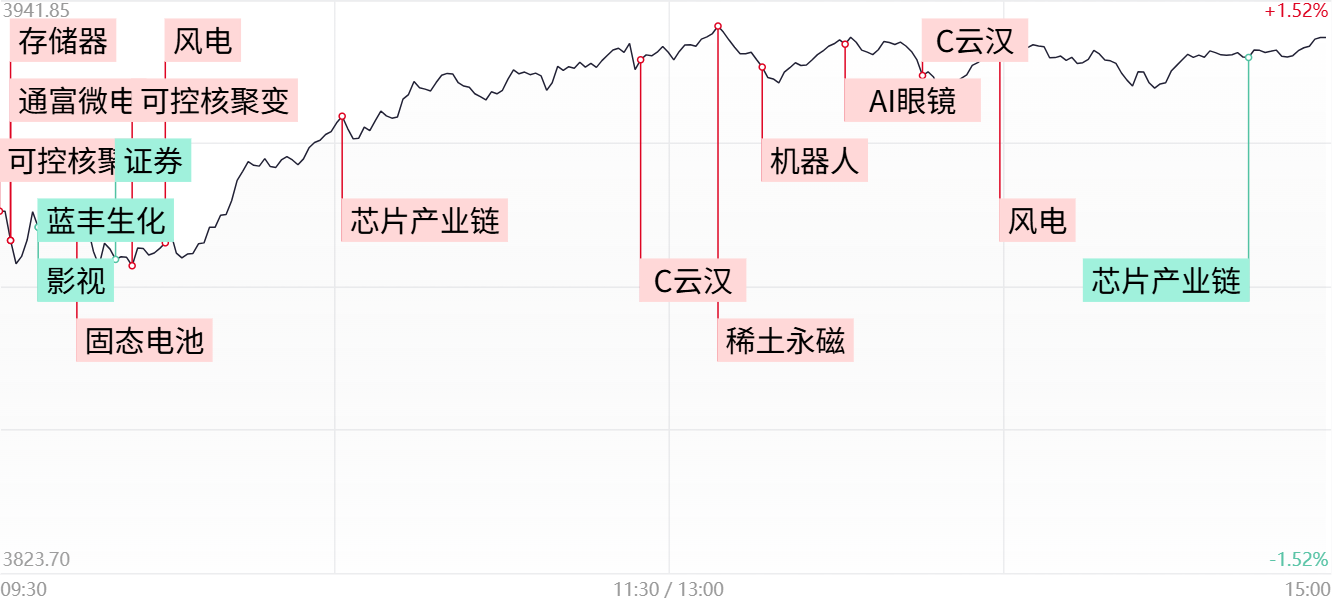 ②盘面上来看,科技股集体反弹,存储芯片全线爆发,逾20股涨超10%,而算力硬件、商业航天等同样涨幅居前。