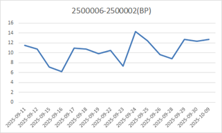 由于30年特别国债不再续发,“2500002”、“2500005”、“2500006”的存续规模分别定格在3550亿元、2480亿元、2470亿元。“2500006”与“2500002”的利差在9月末一度压缩至10BP以内,但在财政部变更四季度特别国债发行计划后又迅速走扩。