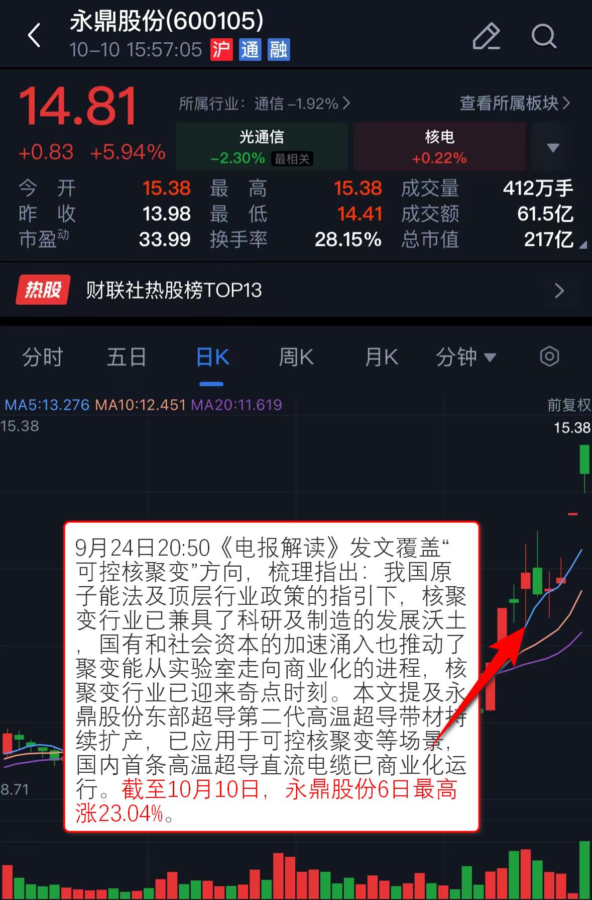 9月24日20:50《电报解读》发文覆盖“可控核聚变”方向,梳理指出:我国原子能法及顶层行业政策的指引下,核聚变行业已兼具了科研及制造的发展沃土,国有和社会资本的加速涌入也推动了聚变能从实验室走向商业化的进程,核聚变行业已迎来奇点时刻。本文提及永鼎股份东部超导第二代高温超导带材持续扩产,已应用于可控核聚变等场景,国内首条高温超导直流电缆已商业化运行。截至10月10日,永鼎股份6日最高涨23.04%。