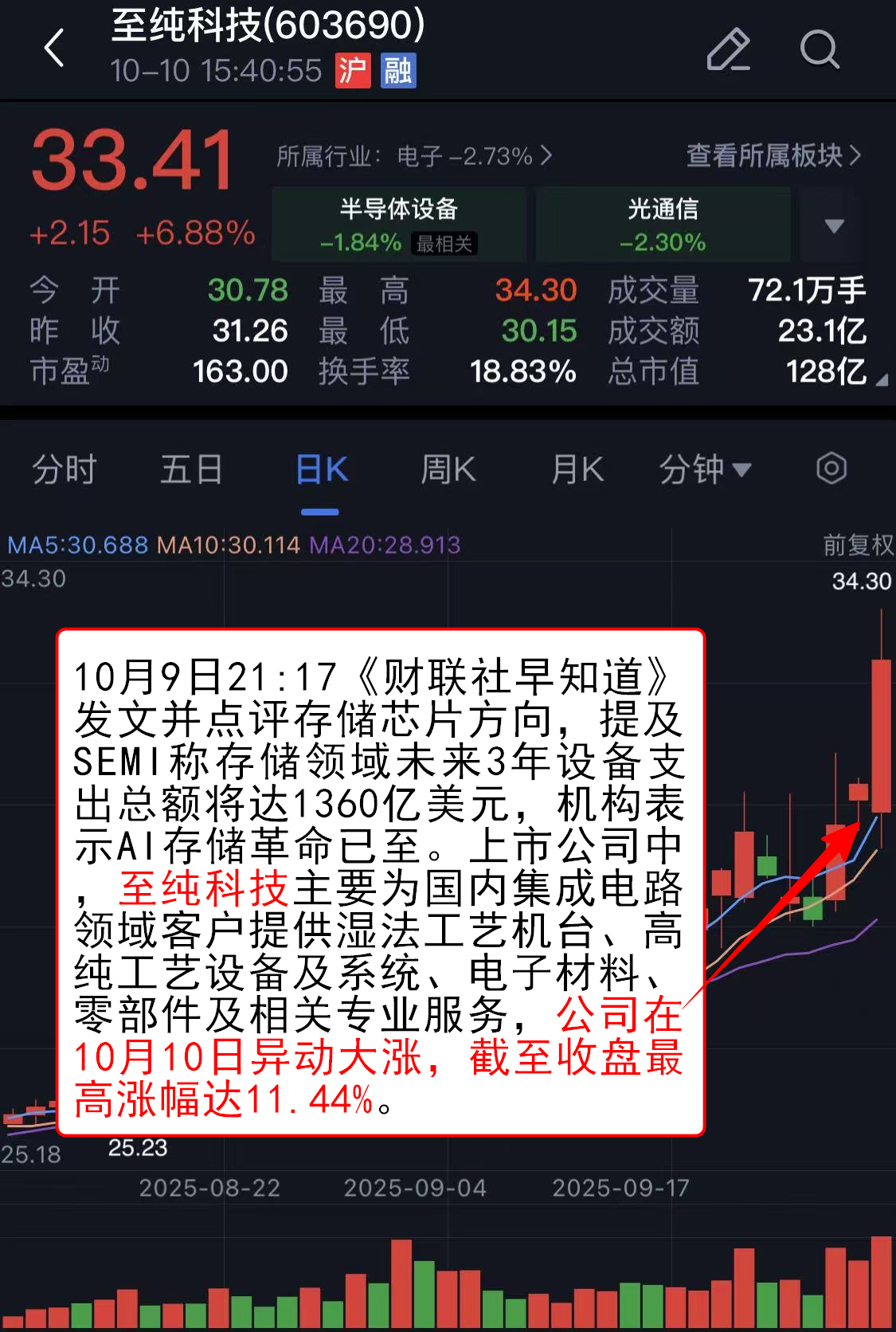 10月9日21:17《财联社早知道》发文并点评存储芯片方向,提及SEMI称存储领域未来3年设备支出总额将达1360亿美元,机构表示AI存储革命已至。上市公司中,至纯科技主要为国内集成电路领域客户提供湿法工艺机台、高纯工艺设备及系统、电子材料、零部件及相关专业服务,公司在10月10日异动大涨,截至收盘最高涨幅达11.44%。