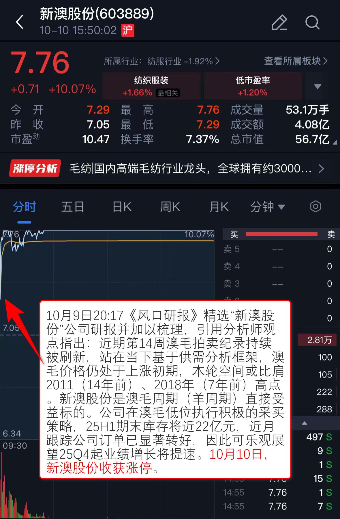 10月9日20:17《风口研报》精选“新澳股份”公司研报并加以梳理,引用分析师观点指出:近期第14周澳毛拍卖纪录持续被刷新,站在当下基于供需分析框架,澳毛价格仍处于上涨初期,本轮空间或比肩2011(14年前)、2018年(7年前)高点。新澳股份是澳毛周期(羊周期)直接受益标的。公司在澳毛低位执行积极的采买策略,25H1期末库存将近22亿元,近月跟踪公司订单已显著转好,因此可乐观展望25Q4起业绩增长将提速。10月10日,新澳股份收获涨停。