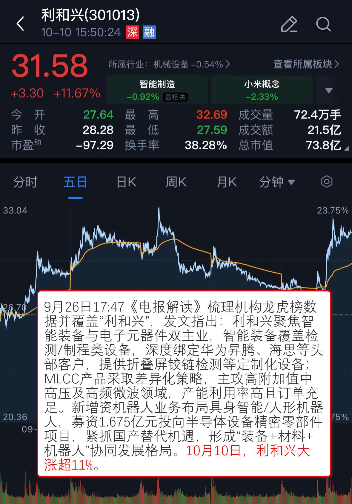 9月26日17:47《电报解读》梳理机构龙虎榜数据并覆盖“利和兴”,发文指出:利和兴聚焦智能装备与电子元器件双主业,智能装备覆盖检测/制程类设备,深度绑定华为昇腾、海思等头部客户,提供折叠屏铰链检测等定制化设备;MLCC产品采取差异化策略,主攻高附加值中高压及高频微波领域,产能利用率高且订单充足。新增资机器人业务布局具身智能/人形机器人,募资1.675亿元投向半导体设备精密零部件项目,紧抓国产替代机遇,形成“装备+材料+机器人”协同发展格局。10月10日,利和兴大涨超11%。