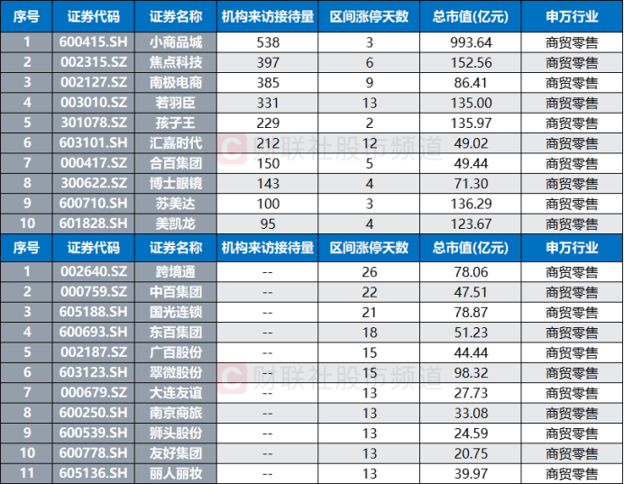 对于可关注标的方面,筛选商贸零售概念股,累计共有9股近1年机构调研量在100次以上,分别为小商品城、焦点科技、南极电商、若羽臣、孩子王、汇嘉时代、合百集团、博士眼镜、苏美达。若以股价活跃度统计,不计算ST股,国芳集团、跨境通、中百集团、国光连锁、步步高、友阿股份、东百集团、华联股份等股近1年涨停次数居前。