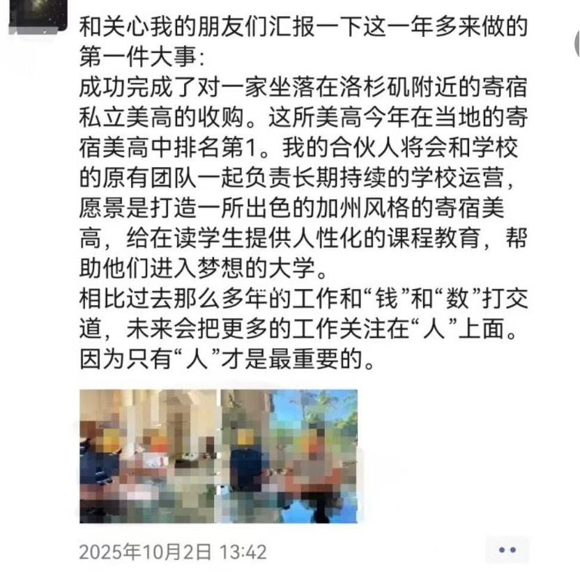 随后,有吴家麒社交平台截图也确认了这一消息,他在朋友圈透露了对美国私立高中的收购,并计划长期持续运营学校。