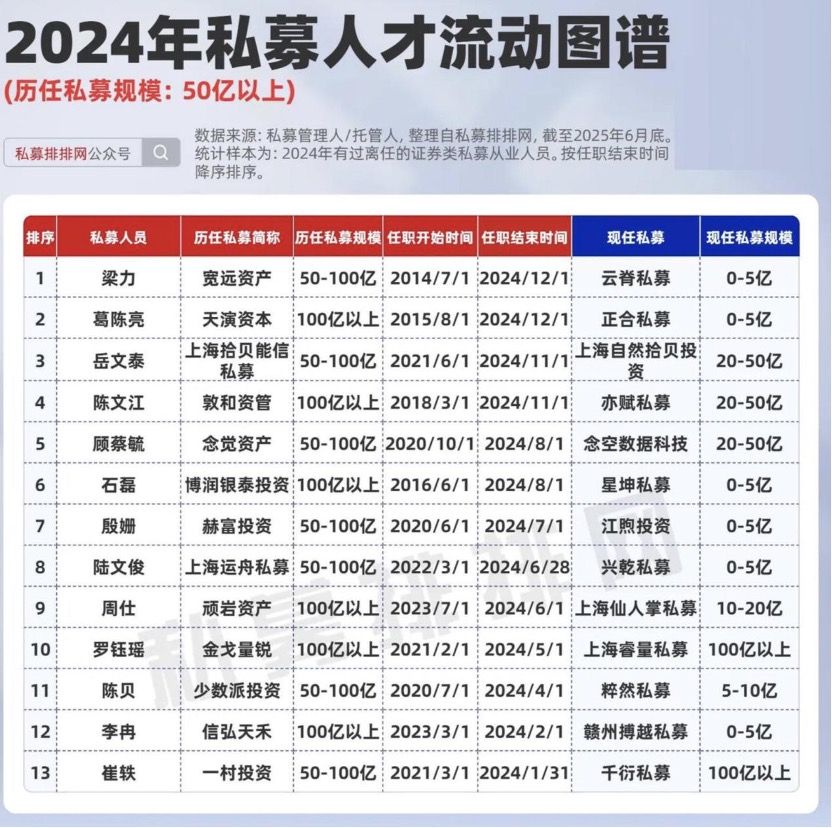 私募排排网数据显示,2024年从50亿以上证券类私募离职的人员共13位,并且这13位均依然任职于证券类私募公司,其中现任职于百亿私募有两位,6位任职于0-5亿私募(其中多位选择创业成立私募)。