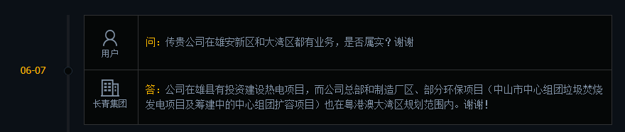 长青集团:公司在雄县有投资建设热电项目,项目供热部分已获得雄县发展改革局核准;公司总部和制造厂区、部分环保项目也在粤港澳大湾区规划范围内。