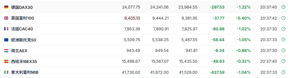 正在交易的欧洲股市多数走低,德国DAX指数现跌1.22%,英国富时100指数跌0.40%,法国CAC40指数跌1.02%。