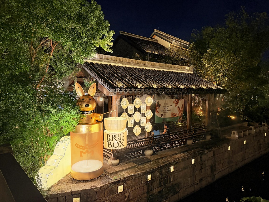 空间以巨型香水瓶艺术装置为视觉中心,PERFUME BOX标志性“盒子”中探出MCM经典熊宝,与一旁的巨型兔宝相映成趣,营造出探秘般的游猎氛围,引导观众步入一场“气味游猎”之旅。品牌策略性地将“气味游猎”主题与场域的“宠物友好”特性相链接,并通过设置多个分散式打卡装置,巧妙引导游客循着“香气线索”游历全场,自然形成一条互动探索路径。