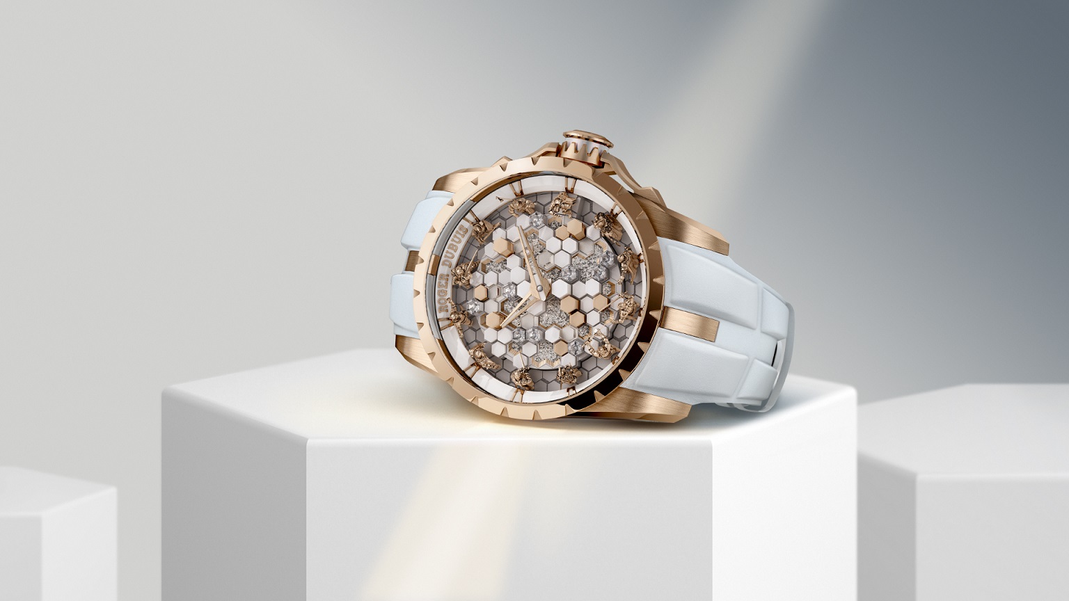 为呈现熠熠夺目的水晶宫之美,罗杰杜彼于这款全新时计的表盘底部精心铺镶了一层钌晶体。作为稀有铂族金属,钌以耀目光泽与冷冽银芒著称,纯钌晶体犹如钻石细粉,幻化波光潋滟的静谧湖面。
