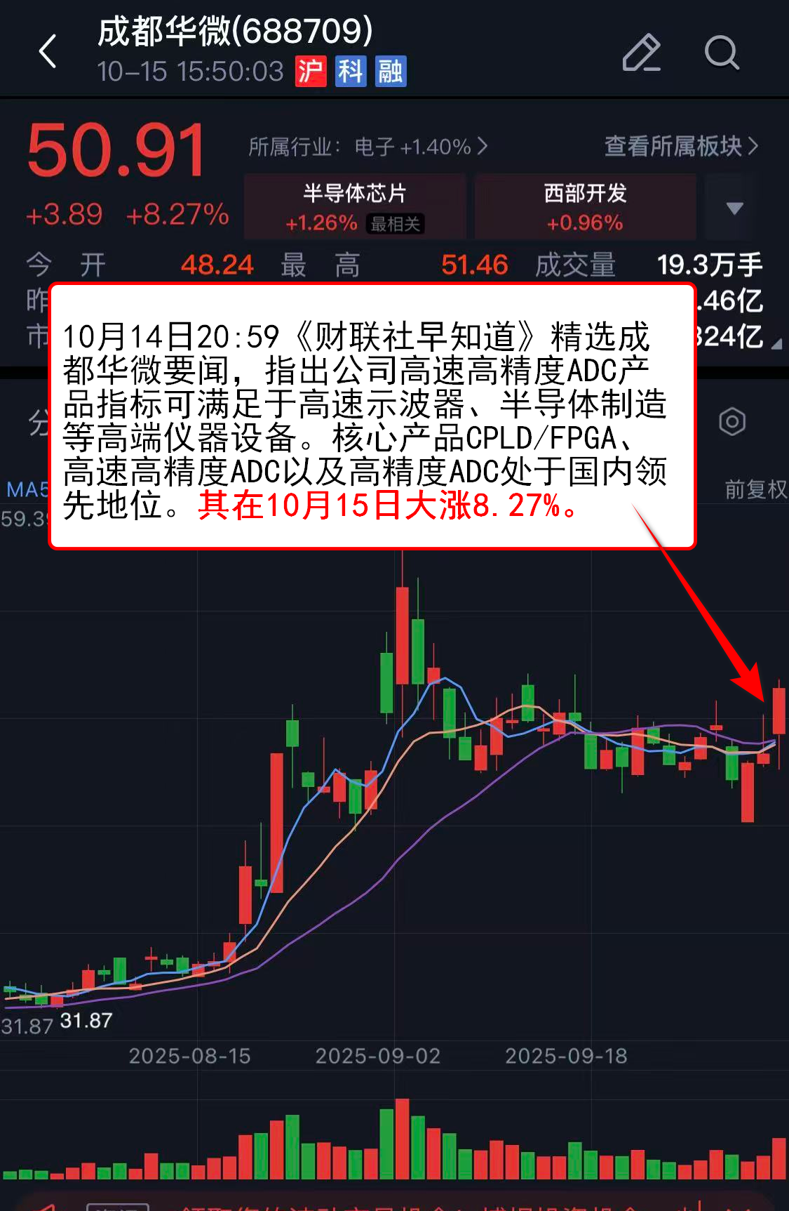 10月14日20:59《财联社早知道》精选成都华微要闻,指出公司高速高精度ADC产品指标可满足于高速示波器、半导体制造等高端仪器设备。核心产品CPLD/FPGA、高速高精度ADC以及高精度ADC处于国内领先地位。其在10月15日大涨8.27%。