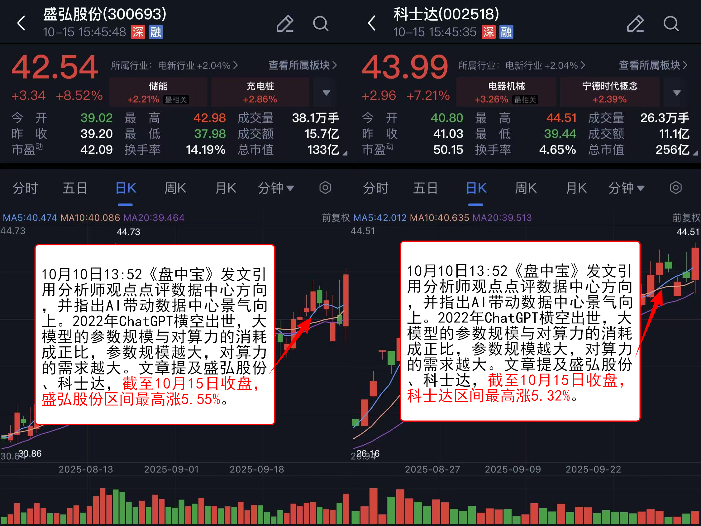 10月10日13:52《盘中宝》发文引用分析师观点点评数据中心方向,并指出AI带动数据中心景气向上。2022年ChatGPT横空出世,大模型的参数规模与对算力的消耗成正比,参数规模越大,对算力的需求越大。文章提及盛弘股份、科士达,截至10月15日收盘,科士达区间最高涨5.32%,盛弘股份区间最高涨5.55%。