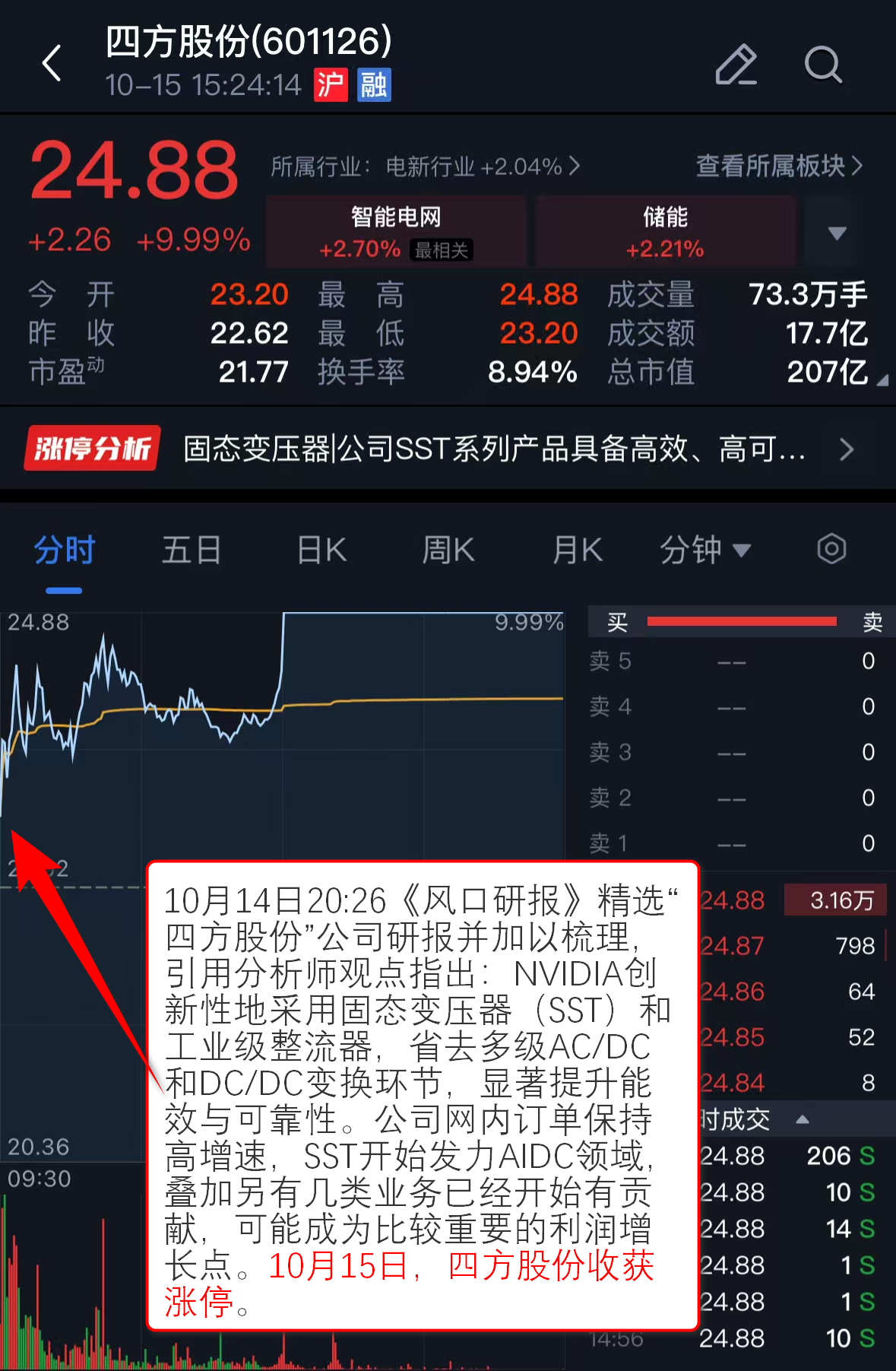 10月14日20:26《风口研报》精选“四方股份”公司研报并加以梳理,引用分析师观点指出:NVIDIA创新性地采用固态变压器(SST)和工业级整流器,省去多级AC/DC和DC/DC变换环节,显著提升能效与可靠性。公司网内订单保持高增速,SST开始发力AIDC领域,叠加另有几类业务已经开始有贡献,可能成为比较重要的利润增长点。10月15日,四方股份收获涨停。