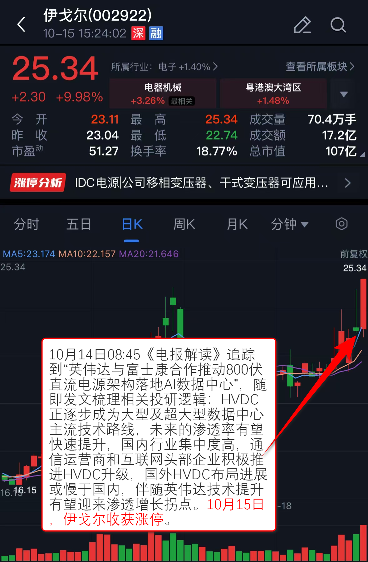 10月14日08:45《电报解读》追踪到“英伟达与富士康合作推动800伏直流电源架构落地AI数据中心”,随即发文梳理相关投研逻辑:HVDC正逐步成为大型及超大型数据中心主流技术路线,未来的渗透率有望快速提升,国内行业集中度高,通信运营商和互联网头部企业积极推进HVDC升级,国外HVDC布局进展或慢于国内,伴随英伟达技术提升有望迎来渗透增长拐点。10月15日,伊戈尔收获涨停。