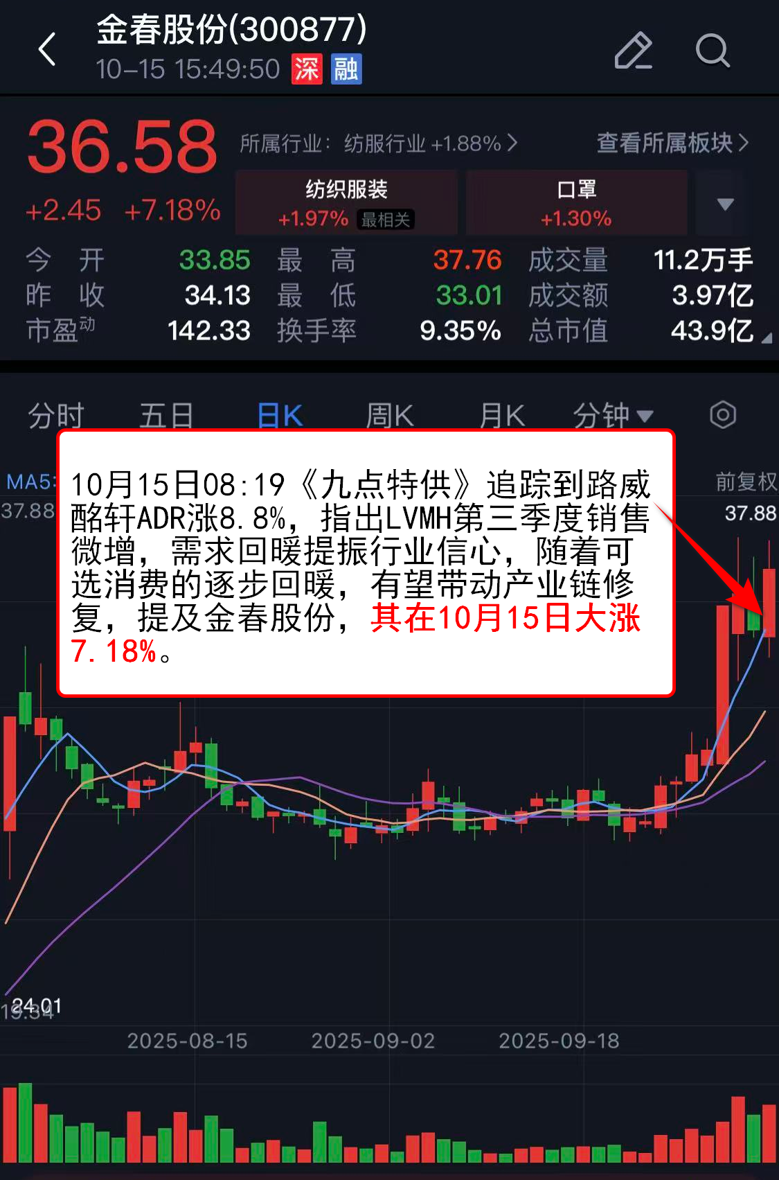10月15日08:19《九点特供》追踪到路威酩轩ADR涨8.8%,指出LVMH第三季度销售微增,需求回暖提振行业信心,随着可选消费的逐步回暖,有望带动产业链修复,提及金春股份,其在10月15日大涨7.18%。