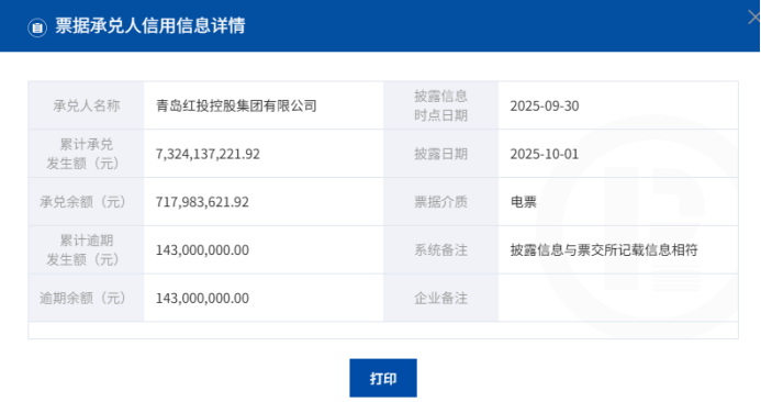 财联社10月15日讯(编辑 张良 实习编辑 马雨佞)近日,上海票据交易所披露截至2025年9月30日承兑人逾期名单,青岛红投控股集团有限公司(简称“红投控股集团”)首次被列入名单,引发市场关注。根据票交所官网显示,截至9月30日,公司票据承兑逾期余额1.43亿元。据了解,红投控股集团目前存续债券4只,债券存量规模16.8亿元。