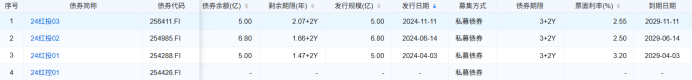 存续债方面,财联社查询发现,红投控股集团共有4只存续债券,债券存量规模16.8亿元,最新发行的“24红投03”债券余额5亿元,票面利率2.55 %。(图:红投控股集团存续债券)