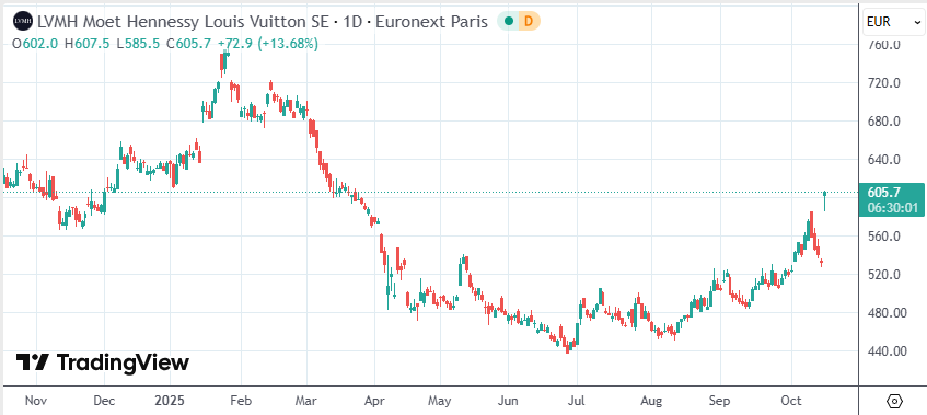 经历了一段时间回调后,这家全球最大奢侈品集团,终于迎来积极信号。LVMH周二(10月14日)发布的业绩报告标题就为《2025年第三季度趋势改善》。受该消息影响,LVMH欧股周三早盘涨近1%,股价创今年3月以来的最高水平。