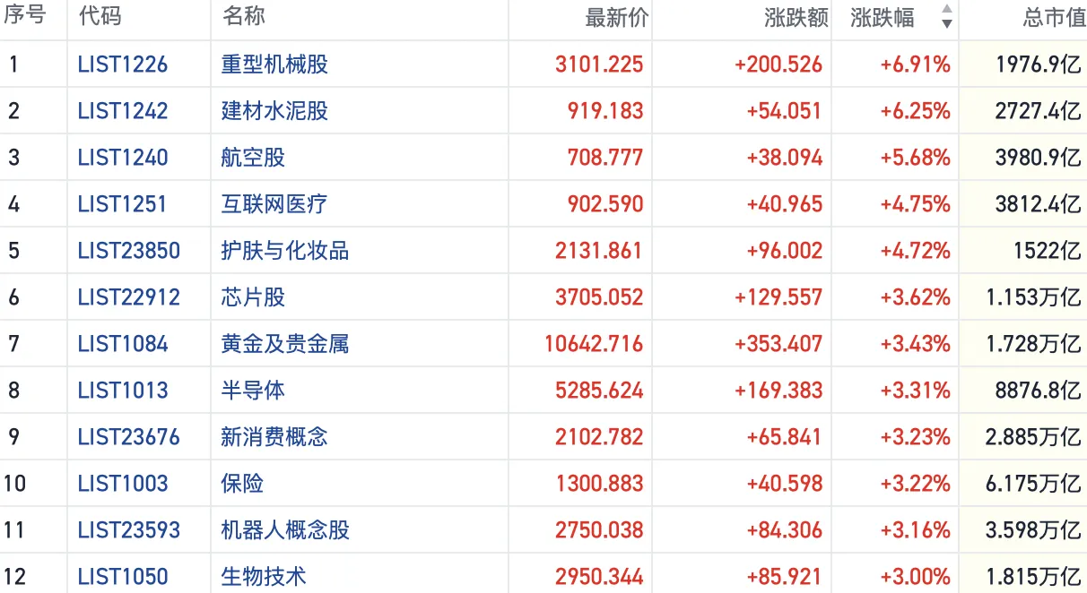 其他方向上,机械、钢铁、建材等周期股短线走强,大消费板块热度升温。此外,保险、半导体、黄金、汽车、券商等行业也反弹走高。