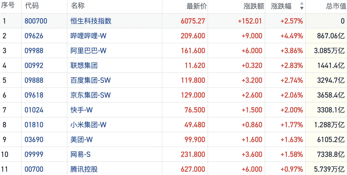 盘面上,今日大型科网股集体回暖,并带领大市反弹。阿里巴巴涨近4%,百度涨近3%,京东、快手涨2%,小米、美团、网易涨超1.5%,腾讯涨约1%。