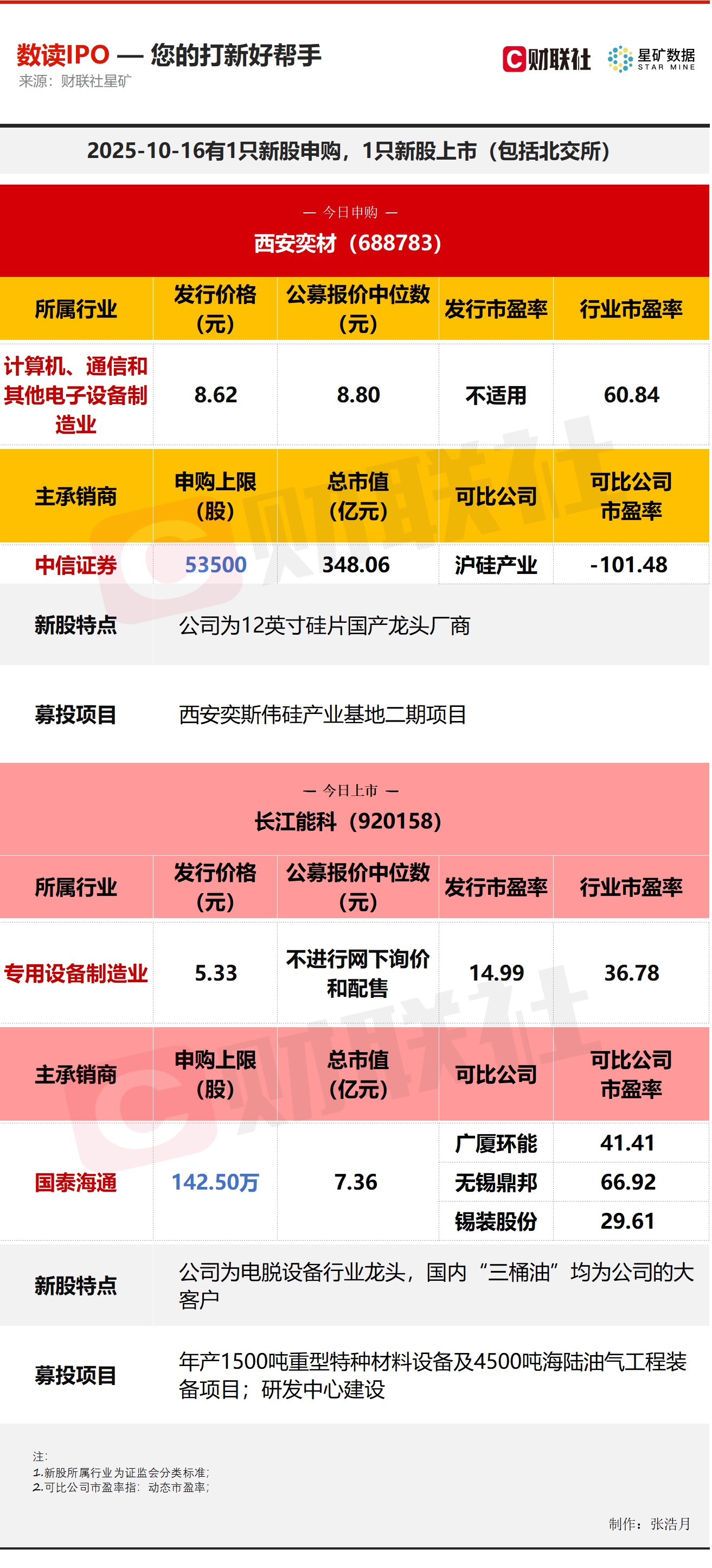 财联社10月16日讯,今日有1只新股申购,为科创板的西安奕材;1只新股上市,为北交所的长江能科。