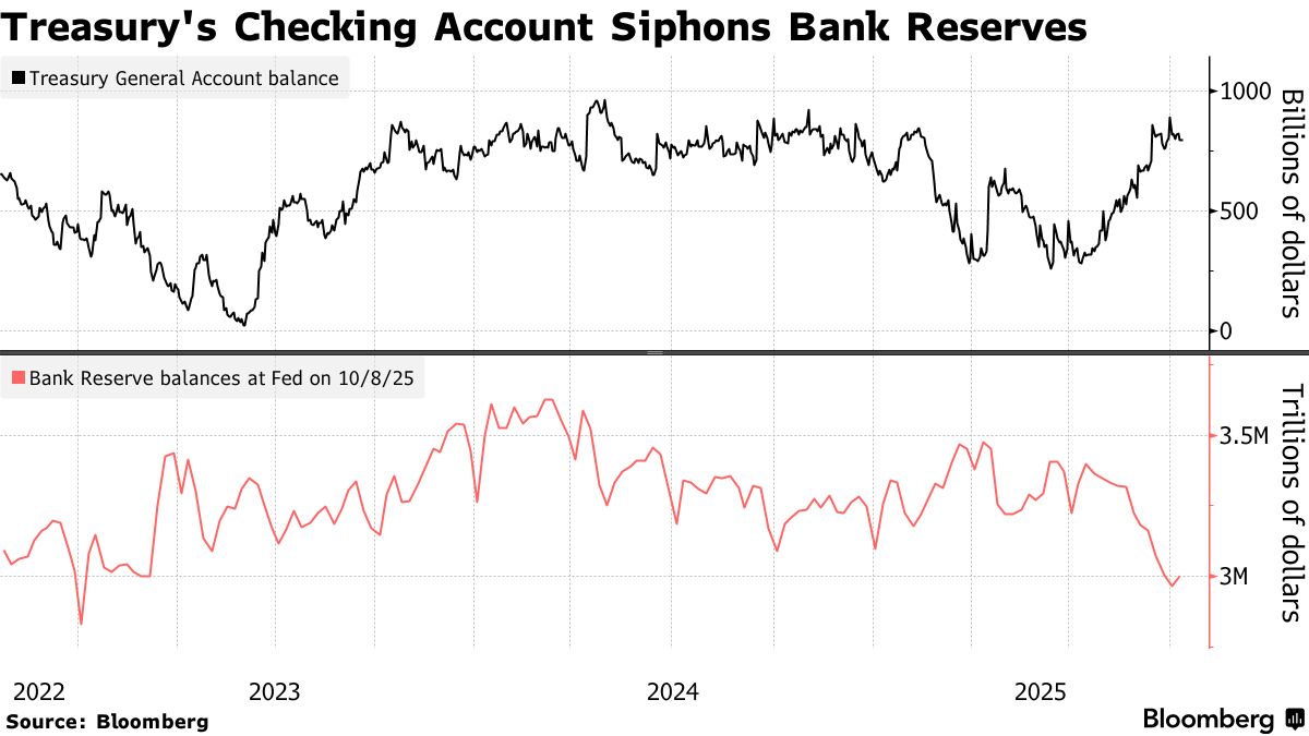 与此同时,根据美联储最新披露的数据,截至10月8日,美联储体系中的银行准备金总额已降至3.03万亿美元,此前曾一度短暂跌破3万亿美元。美联储理事沃勒之前曾估计,银行准备金充裕水平的临界线约为2.7万亿美元——显然,可供美联储继续缩表的“安全空间”其实已经不多。