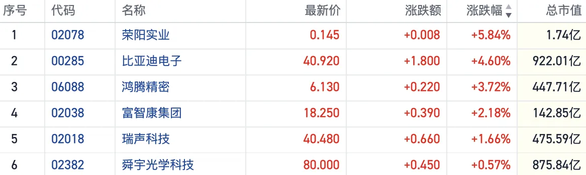 截至发稿,今日比亚迪电子(00285.HK)涨近5%,鸿腾精密(06088.HK)涨超3%,富智康集团(02038.HK)、瑞声科技(02018.HK)等供应链企业也纷纷走强。