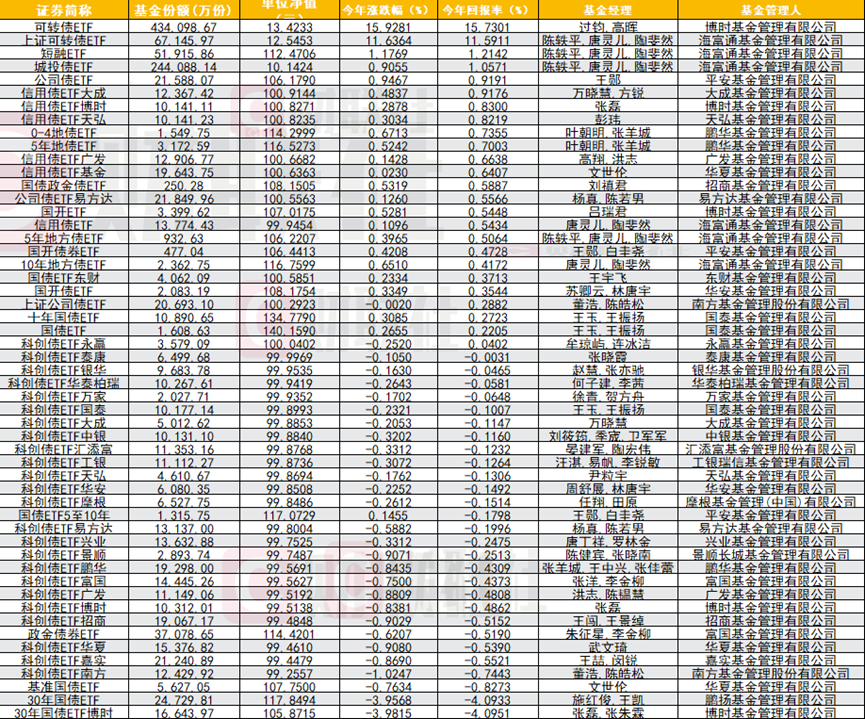从净值表示来看,若剔除权益属性较强的可转债,剩余的51只债券型ETF中,今年表现最好的来自久期最短的短融ETF。Wind数据显示,今年以来,短融ETF至今涨幅为1.21%,此外城投债ETF以1.06%的涨幅排在第二,其余49只产品年内收益均低于1%,其中28只产品年内录得负收益,最高跌幅超4%。